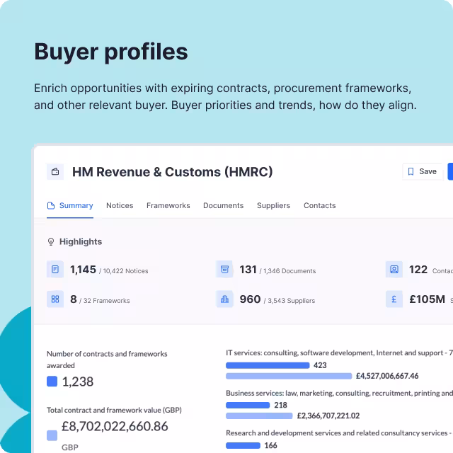 Start by researching which government departments or agencies buy what you sell. Historical contract award data reveals spending patterns, typical contract values, and incumbent suppliers. This analysis helps focus effort on realistic opportunities rather than chasing everything. Below, you can see example screenshots from the Stotles platform showing aan an HMRC buyer profile and a view of suppliers by number of awarded contracts.