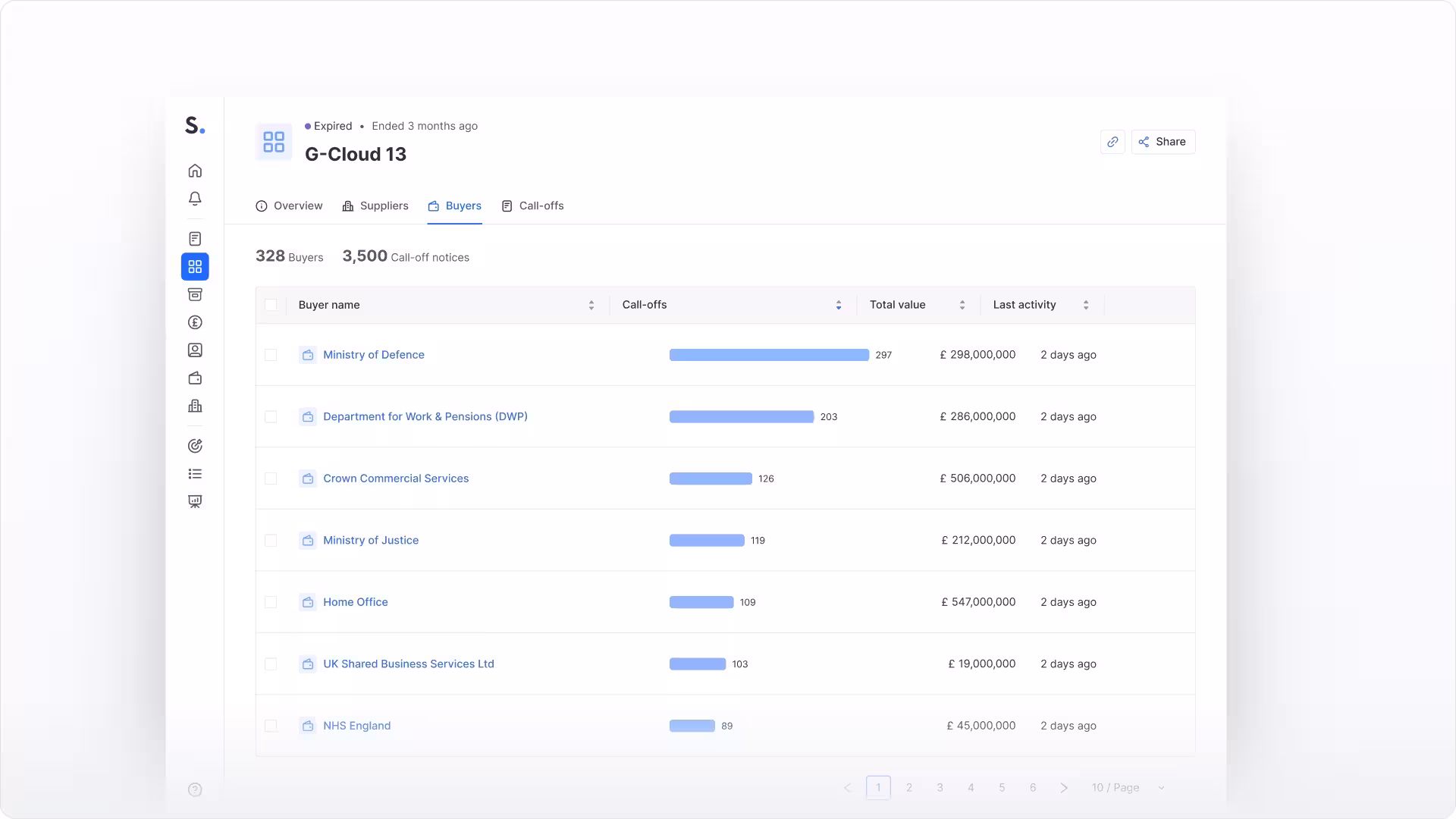 In Stotles, you can search and click into individual frameworks to learn more about suppliers on the framework, buyers using the framework, and the number of call-offs used in the framework.