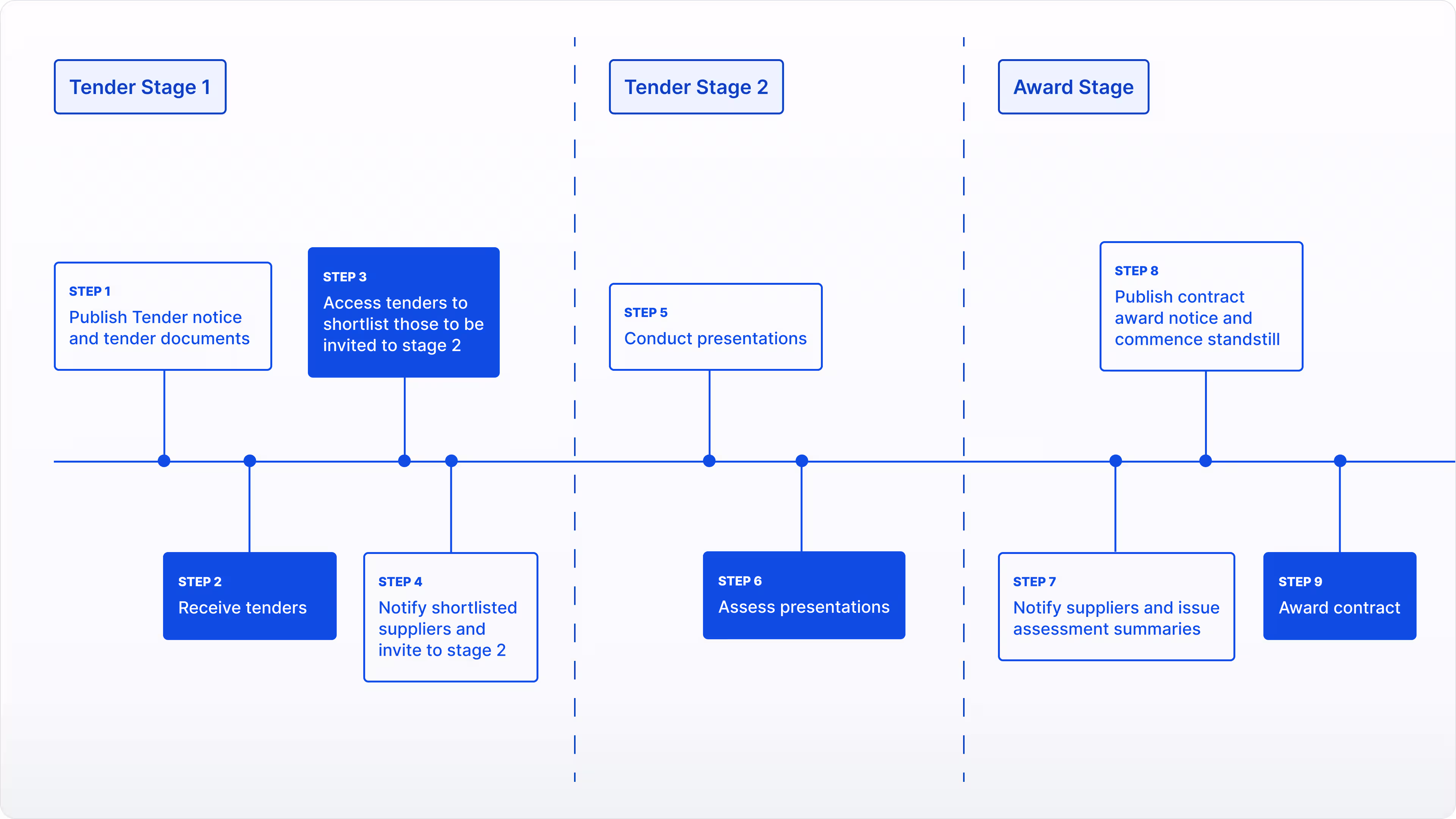 The Act sets only one main rule: there must be at least one competitive stage before the award. Everything else, from how many stages there are to what happens inside each stage, can be shaped by the buyer. Because of this, the CFP can look very different from one project to another. A simple digital tool might use two stages, while a complex infrastructure project may need five or more.